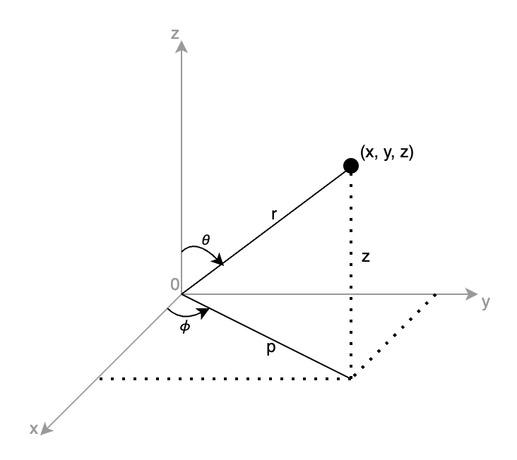 笛卡尔坐标 ($x, y, z$) 与球坐标 ($r, \theta, \phi$) 的变换关系为: $$ \begin{cases} x = r \sin\theta \cos\phi \ y = r \sin\theta \sin\phi \ z = r \cos\theta \end{cases} $$